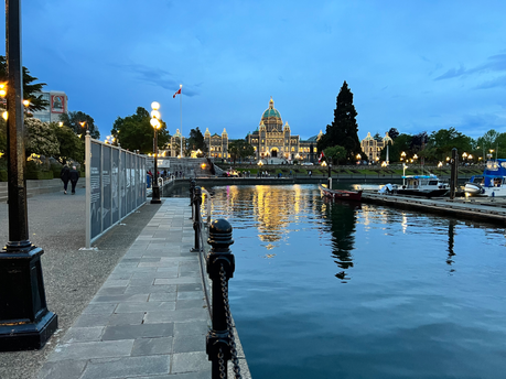 We left customs with never seeing a person, only a phone call. Nothing was verified that we were in fact who we said we were. Causeway Marina was our stop for the night. A very friendly deck hand greeted us upon entry. Causeway had sent a text message 2 hours before our check in time of 1 PM giving us all the details we needed know about staying with them. Slip assignment, gate code, Wi-Fi. They also let us know where the customs dock was located. Texting rather than VHF was their preferred way to communicate. The views from our dock were fun to say the least. We stared directly at the gloriousness of The Empress Hotel off the stern. To our port side we had a full view, framed by sailboat mast of The Parliament Building. That view turned quite spectacular after dark when they lit every detail of its structure with string lights.